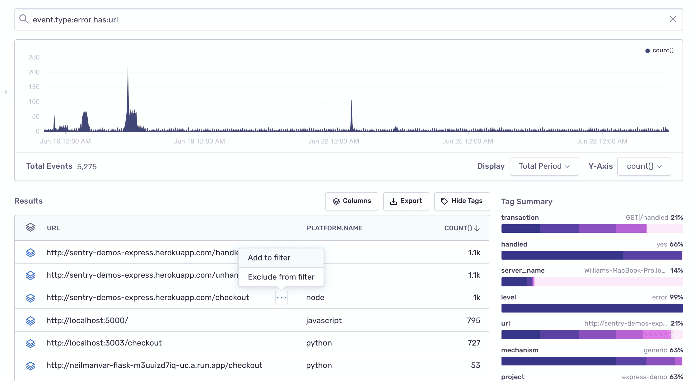 column header to order the line items accordingly.Hover your cursor over the top project line item, click on the actions icon that displays, and select "Add to filter". This will narrow your results even more so that you can continue looking into the issues of that specific project.