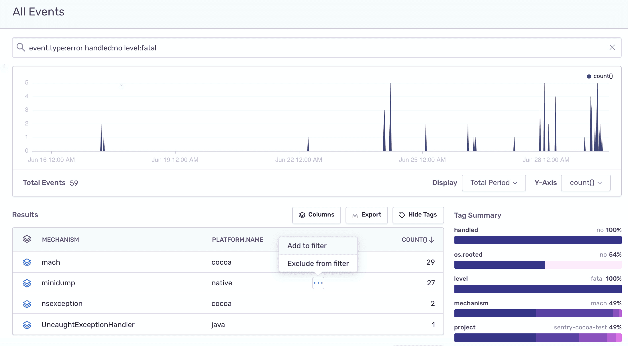 Whether your code is running on mobile, in browser, or on a server, an unhandled fatal error might crash your application. To find out where those crashes are happening, run the following query in Discover: